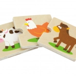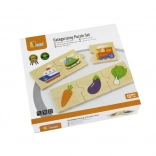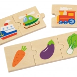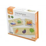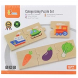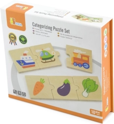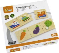 Die Holzpuzzles Logik von VIGA verbinden Spiel und Lernen. Kinder setzen 24 Teile zu 8 sinnvollen Trios zusammen – zum Beispiel drei Tiere, drei Fahrzeuge oder drei Gemüsesorten. So trainieren sie auf natürliche Weise das Erkennen von Kategorien, die Konzentration und den Wortschatz.