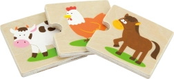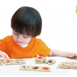 Jedes Teil besteht aus stabilem Holz mit glatten Kanten und auffälligen, farbenfrohen Illustrationen, die die visuelle Wahrnehmung unterstützen und zum weiteren Entdecken motivieren. Das Set eignet sich für das Spielen zu Hause und in Kindergärten – ideal für Aktivitäten wie Sortieren, Benennen und gemeinsames Lösen von Aufgaben.