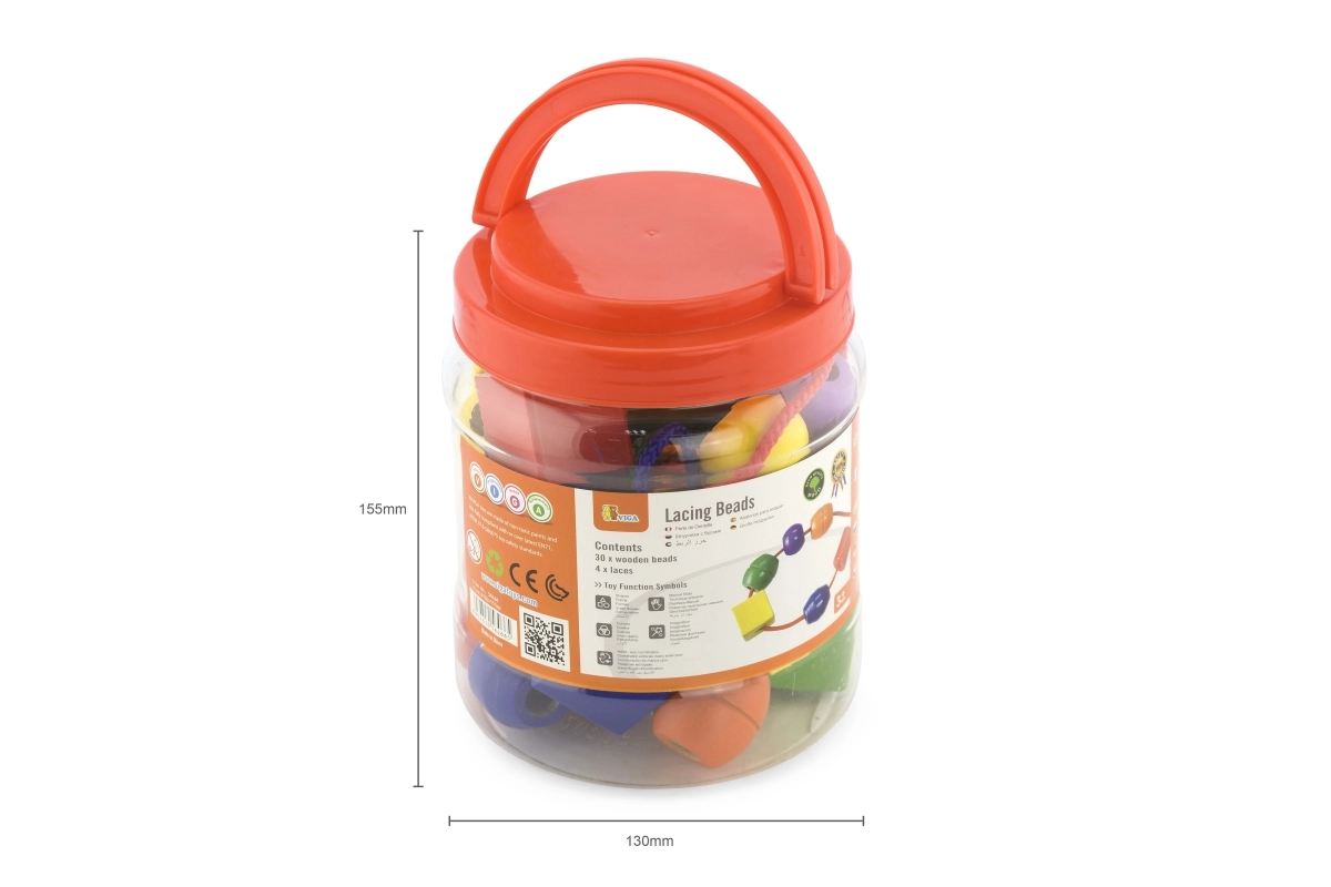 Dieses Set extra großer Holzperlen ist ein ideales Spielzeug für die frühe Entwicklung. Dank der kräftigen Farben und unterschiedlichen Formen üben Kinder das Sortieren, Zählen und ihre Kreativität, während sie Griffkraft und Konzentration stärken. Die Größe der Perlen ist auf Kinderhände abgestimmt, sodass das Auffädeln leicht und spielerisch gelingt.
