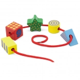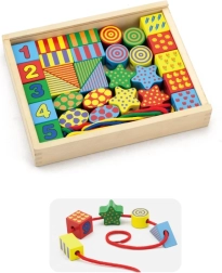 Dieses Holz-Fädelset bietet Kindern unendliche Gestaltungsmöglichkeiten: Auffädeln wie Perlen, Bauen von Türmen und Häuschen oder Sortieren nach Farben und Formen. Große Teile (ca. 4 cm) liegen gut in der Hand und sind ideal für erste motorische Übungen.