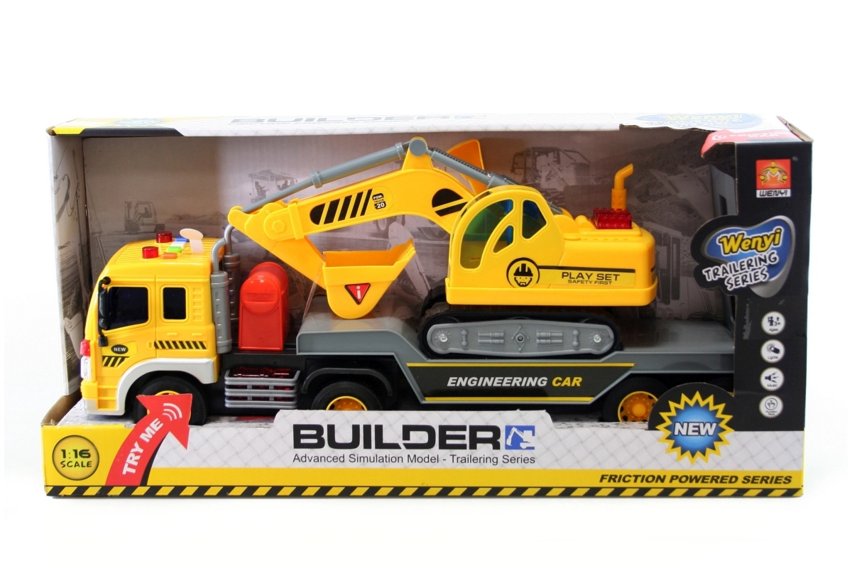 Ein unterhaltsames Set für kleine Fahrer enthält einen großen Sattelschlepper und einen Bagger im Maßstab 1:16. Beim Drücken der Tasten auf der Motorhaube gibt der Sattelschlepper realistische Geräusche von sich und leuchtet, eine klappbare Rampe für einfaches Beladen ist ebenfalls vorhanden. Knopfzellen sind enthalten. Geeignet für Kinder ab 3 Jahren.