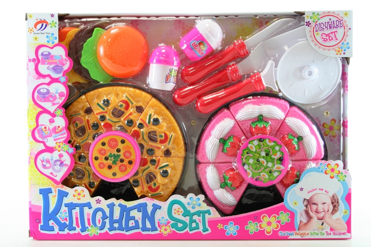 Ein unterhaltsames Plastik-Set für kleine Köche enthält einen in Stücke geschnittenen Kuchen und Torte, einen Hamburger, einen Salzstreuer, einen Pfefferstreuer und Küchenutensilien. Ideal für Rollenspiele rund ums Kochen und zur Förderung der Motorik. Sichere Ausführung aus Kunststoff, realistische Zubehörteile und leichtes Schneiden in Stücke begeistern Kinder ab 3 Jahren.