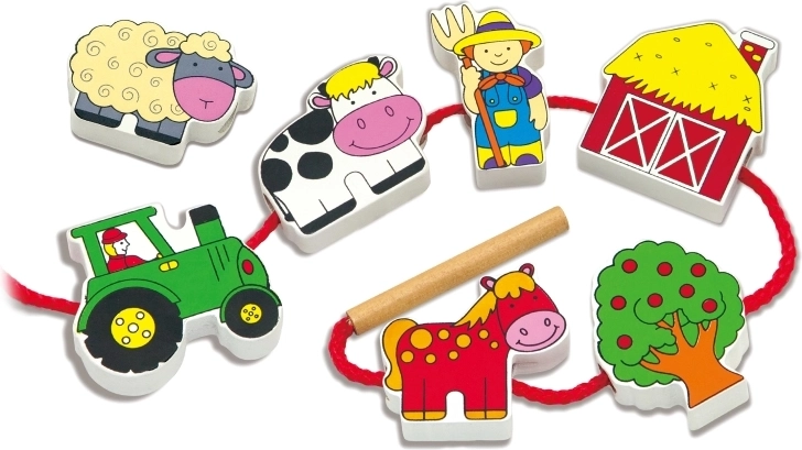 VIGA Holz Bauernhof Perlen sind so konzipiert, dass sie jedes Kind begeistern. Dieses Set enthält 12 bunte Klötze mit Bauernhof-Motiven, die Ihr Kind mit der mitgelieferten Schnur auffädeln kann. Es gibt verschiedene Formen wie Kuh, Ente, Katze, Huhn, Hund, Pferd, Schaf, Bauer und seine Frau, Traktor, Scheune und Apfelbaum.