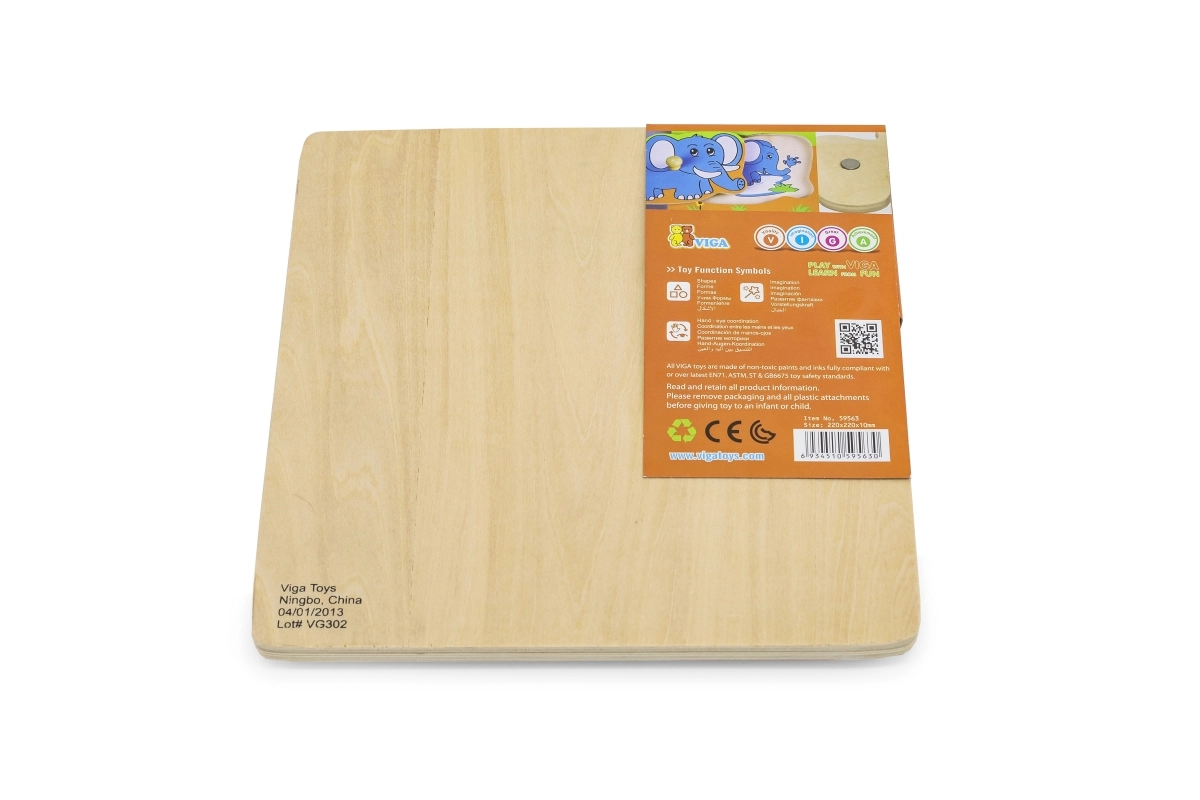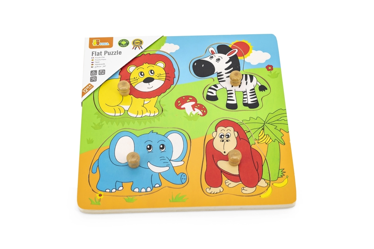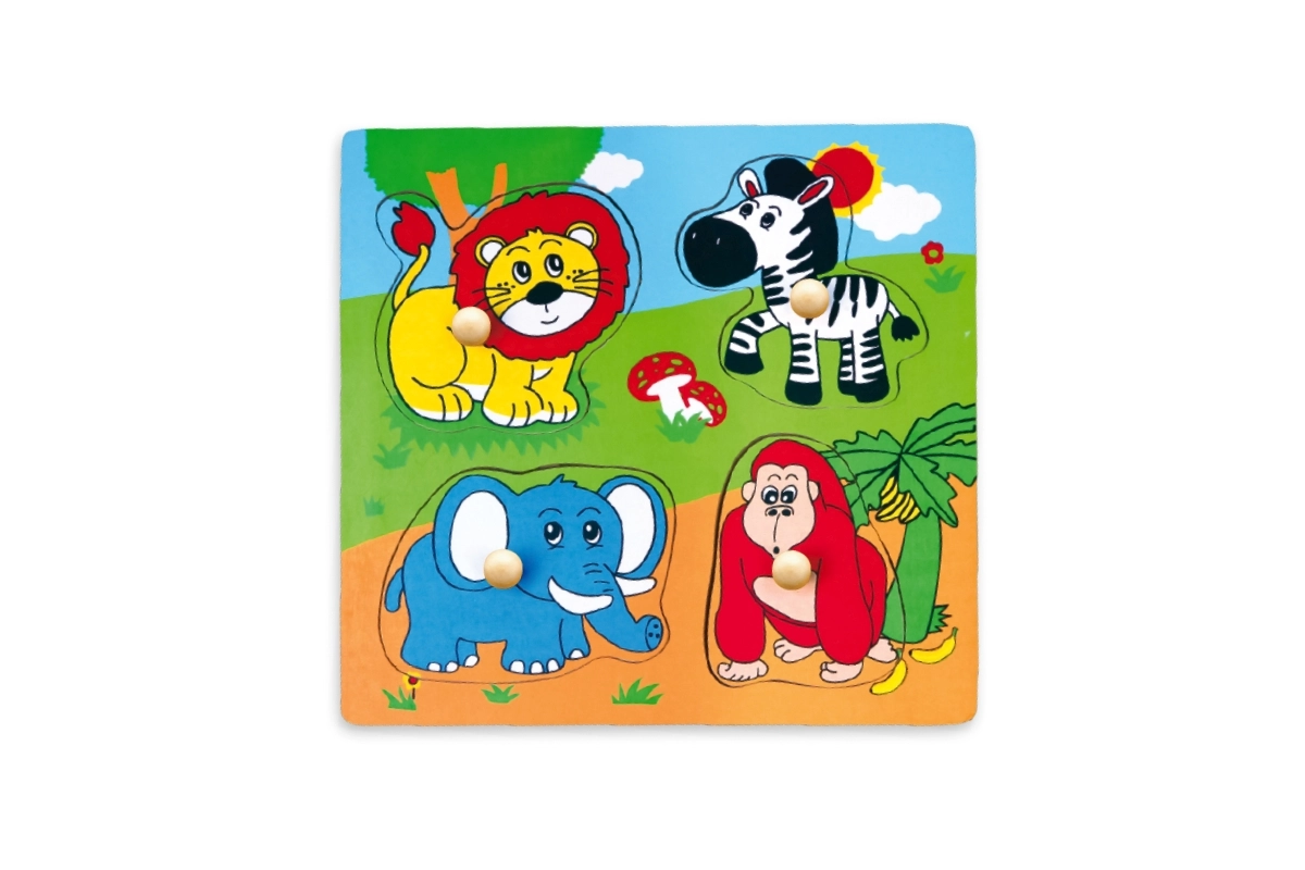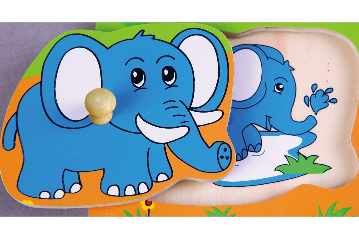 Dieses hochwertige Holz-Steckpuzzle mit Safari-Motiv ist ein ideales erstes Puzzle für Kleinkinder. Jedes Teil verfügt über einen Holzknopf für ein leichtes Greifen mit kleinen Händen und eine passende Silhouette auf der Grundplatte für bessere Orientierung.