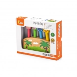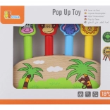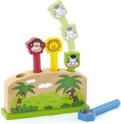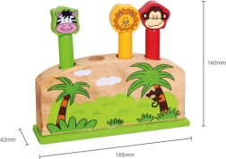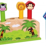 Dieses Holz-Pop-up-Spiel mit Tieren ist ein ideales erstes Motorikspielzeug. Kinder stecken die Tierstifte in die Öffnungen, und nach dem Drücken der Feder springen die Figuren fröhlich heraus. Die robuste Holzbasis mit Dschungelmotiv und die freundlichen Tiere laden zu wiederholtem Spielen ein und fördern Geduld sowie Konzentration.