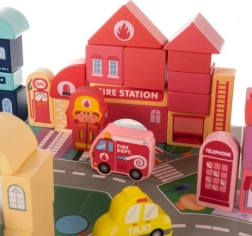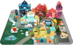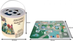 Kruzzel-Holzblöcke bieten Kindern die Möglichkeit, ihre kreativen Fähigkeiten zu entwickeln und dabei etwas über das städtische Umfeld zu lernen. Teil des Sets ist eine bunte Spielunterlage, die eine Stadt mit Straßen und Gebäuden darstellt, und fantastische Möglichkeiten für imaginäres Spiel bietet.