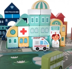 Kreatives und unterhaltsames Spielzeug für Kinder – Holzblöcke, die eine Stadt darstellen, sind die ideale Wahl zur Förderung der kindlichen Fantasie und manuellen Fähigkeiten. Das Set enthält 100 Blöcke und 20 Puzzles, die den Bau verschiedener Stadtszenarien und Häuser ermöglichen.