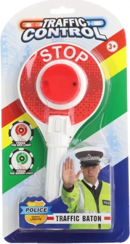 Polizeikelle mit Licht. Eine Seite leuchtet rot, die andere grün. Betrieb mit 2x AA-Batterien (im Lieferumfang enthalten). Größe der Kelle ca. 23 cm. Verpackungsmaße ca. 30 x 16 x 3 cm. Alter 3+