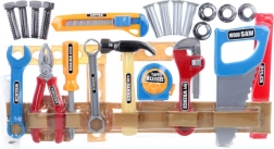 Entdecken Sie ein unterhaltsames und sicheres plastisches Werkzeugset für kleine Heimwerker, das Feinmotorik, Kreativität und Fantasie fördert. Im praktischen Set finden Sie alles für das Spiel als Reparateur – Säge, Zange, Hammer, Rohrzange, Schraubendreher, Schlüssel, Messer sowie einen Gürtel zur Ordnung des Werkzeugs. Ideal für Kinder ab 3 Jahren.