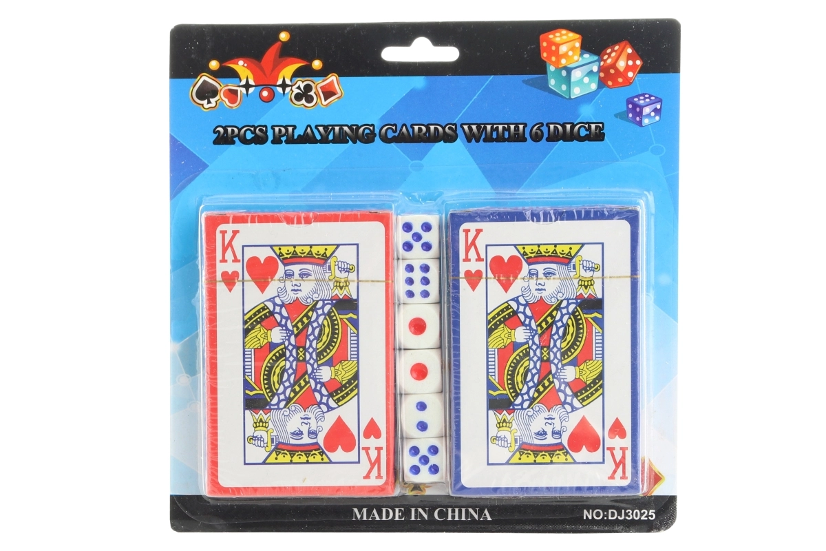 Unterhaltsames Set für die ganze Familie: Jokerkarten mit zwei Decks und sechs Würfeln. Ideal für klassische Kartenspiele und Würfelvarianten. Praktische Verpackung, leicht zu transportieren und eine großartige Wahl für Kinder ab 3 Jahren und Erwachsene.