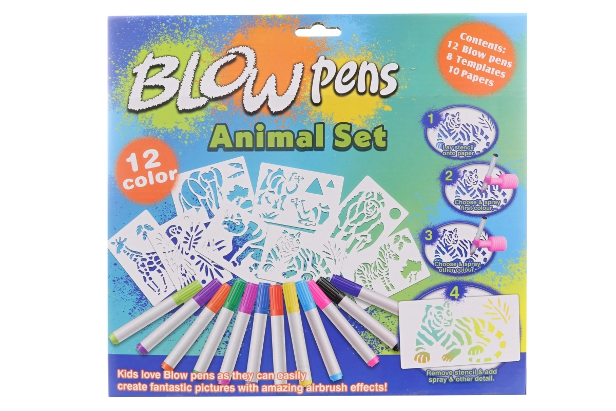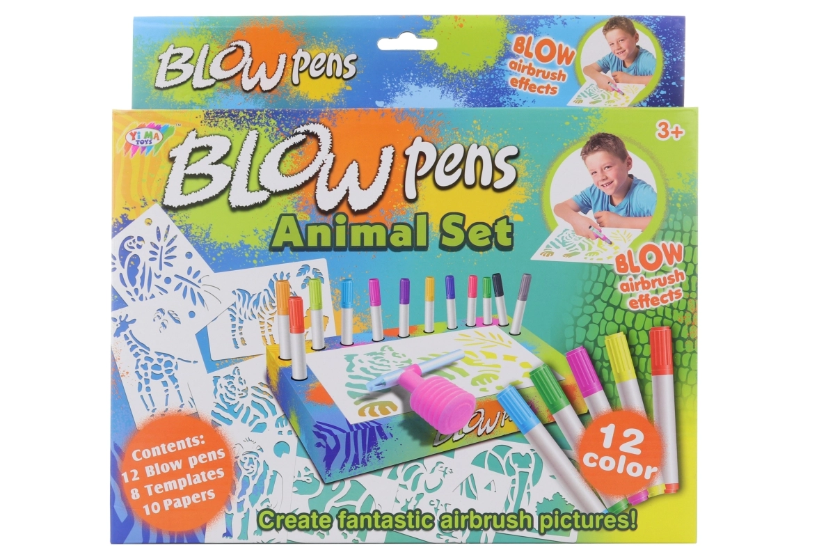 Mit diesem großen Blasstifte-Set erstellen Kinder mühelos originelle Bilder mit Safari-Tieren. Dank des Aufsatzes mit Pumpe ist kein starker Atem nötig – die Farbe wird in einem feinen Strom aufgetragen und erzeugt beeindruckende Verläufe und Schattierungen. Der praktische Ständer mit Halterung sorgt für Ordnung und Übersicht.