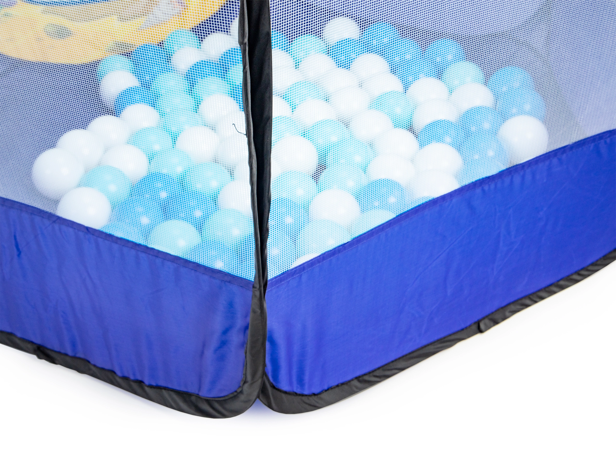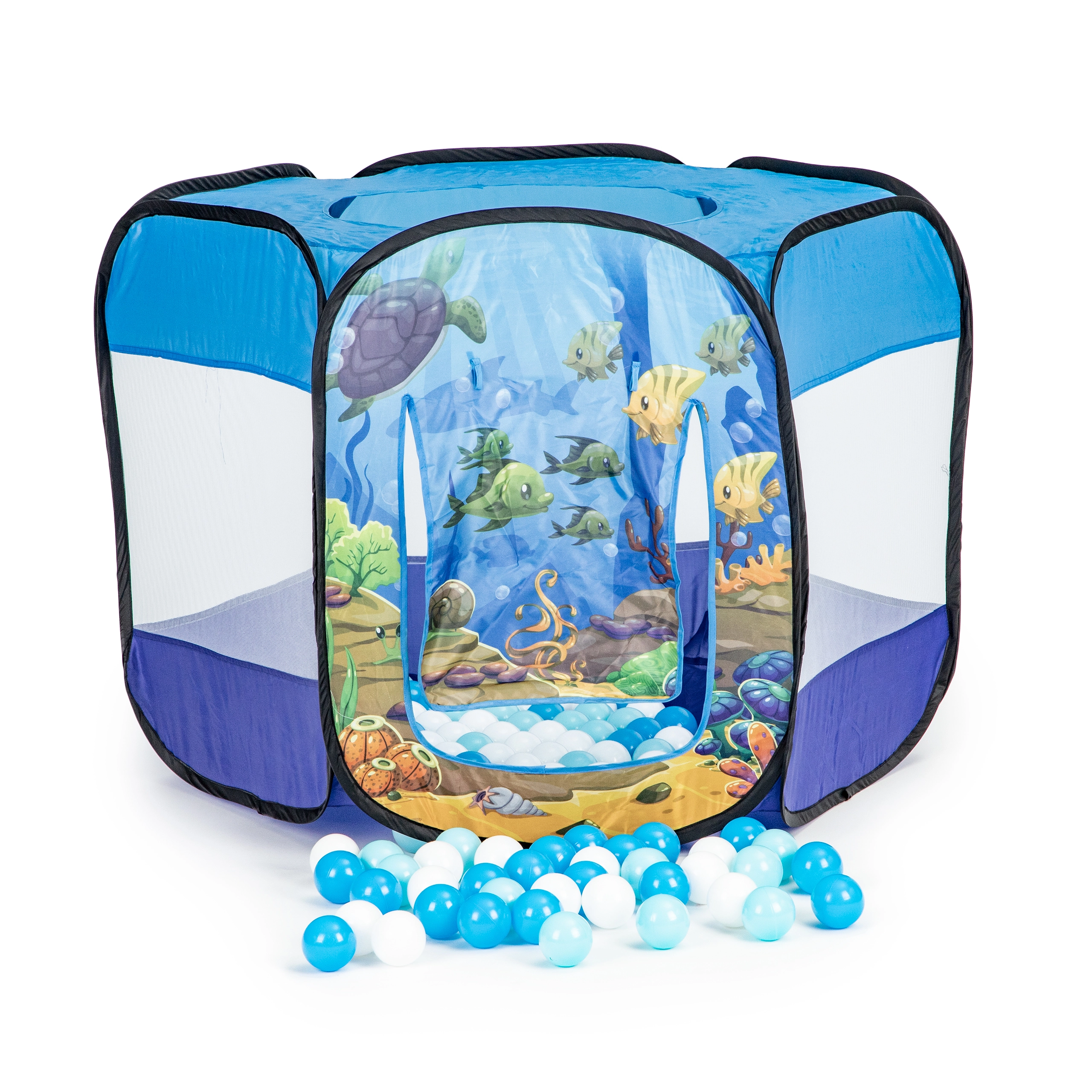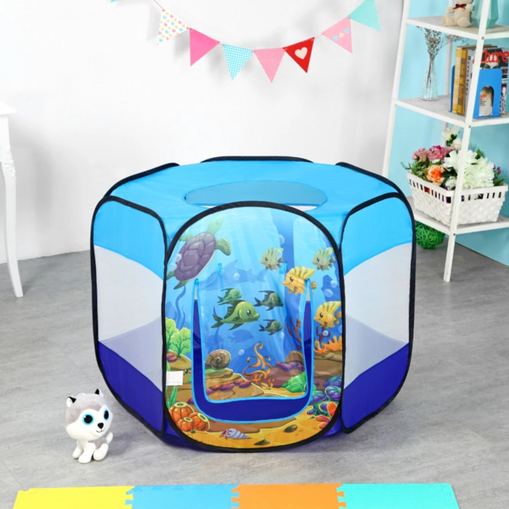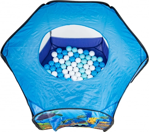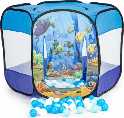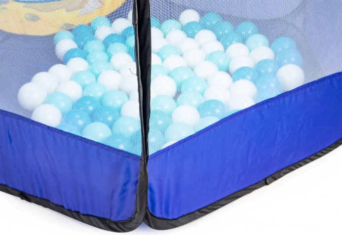 Der bunte Ozean-Print regt die Fantasie an, und 100 Kunststoffbälle (Ø 6 cm) sorgen für stundenlangen Spielspaß. Der verstärkte Boden erhöht den Komfort und die Widerstandsfähigkeit beim Spielen zu Hause und im Garten.