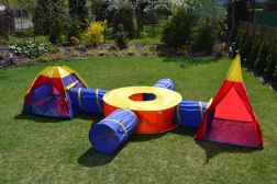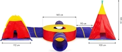 Kombinieren Sie Iglu, Tipi, Rundzentrum und 4 Tunnel in beliebiger Anordnung. Jedes Element kann auch einzeln genutzt werden – ideal für Wohnung und Garten.