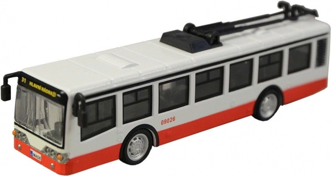 Entdecken Sie einen detailreich gestalteten Trolleybus in der klassischen rot-weiß-schwarzen Farbkombination, wie man sie aus einigen tschechischen Städten kennt. Das Modell ist aus hochwertigem Metall mit Kunststoffteilen gefertigt und liegt dadurch stabil und leicht in Kinderhänden. Dank des Rückzieh-Antriebs fährt der Trolleybus nach dem Loslassen von allein los und sorgt für viel Spielspaß.