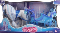 Pferdchen mit blauem Wagen. Nach dem Einlegen der Batterien läuft das Pferd, spielt Musik und an dem Wagen leuchten kleine Laternen. Betrieb mit 2 AA-Batterien (nicht im Lieferumfang enthalten). Verpackungsmaße ca. 56 × 30 × 19 cm. Alter 3+.