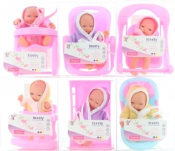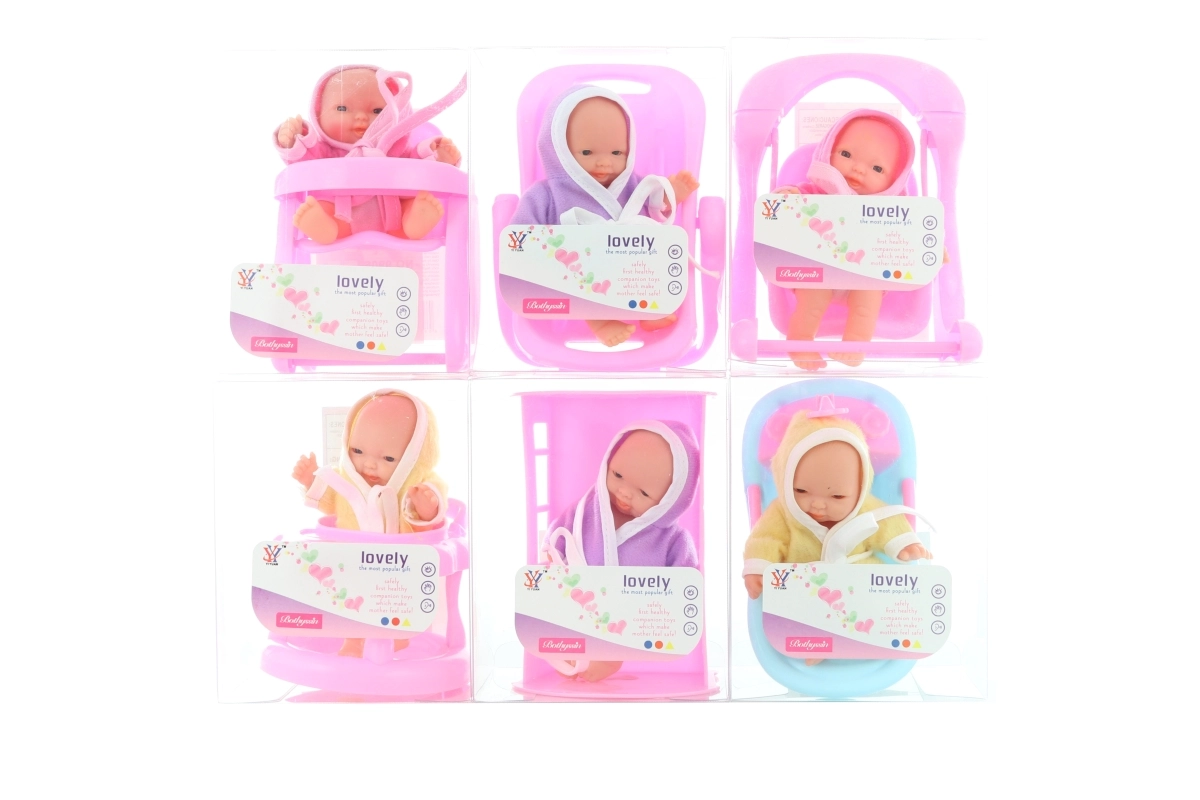 Entdecken Sie die Magie der Babypflege mit einer süßen Puppe und thematischen Accessoires. Jeder Satz enthält eine andere Ausstattung – von Stühlchen über Badewanne und Bettchen bis zur Lauflernhilfe – sowie ein passendes Outfit. Dank der Größe von ca. 10 cm ist die Puppe leicht, einfach zu transportieren und liegt bestens in kleinen Händen.