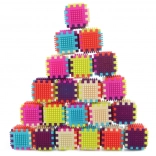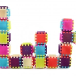 Leuchtende Farben und leicht miteinander verbindbare Steine inspirieren Kinder, Türme, Häuschen und fantasievolle Objekte zu erschaffen.