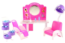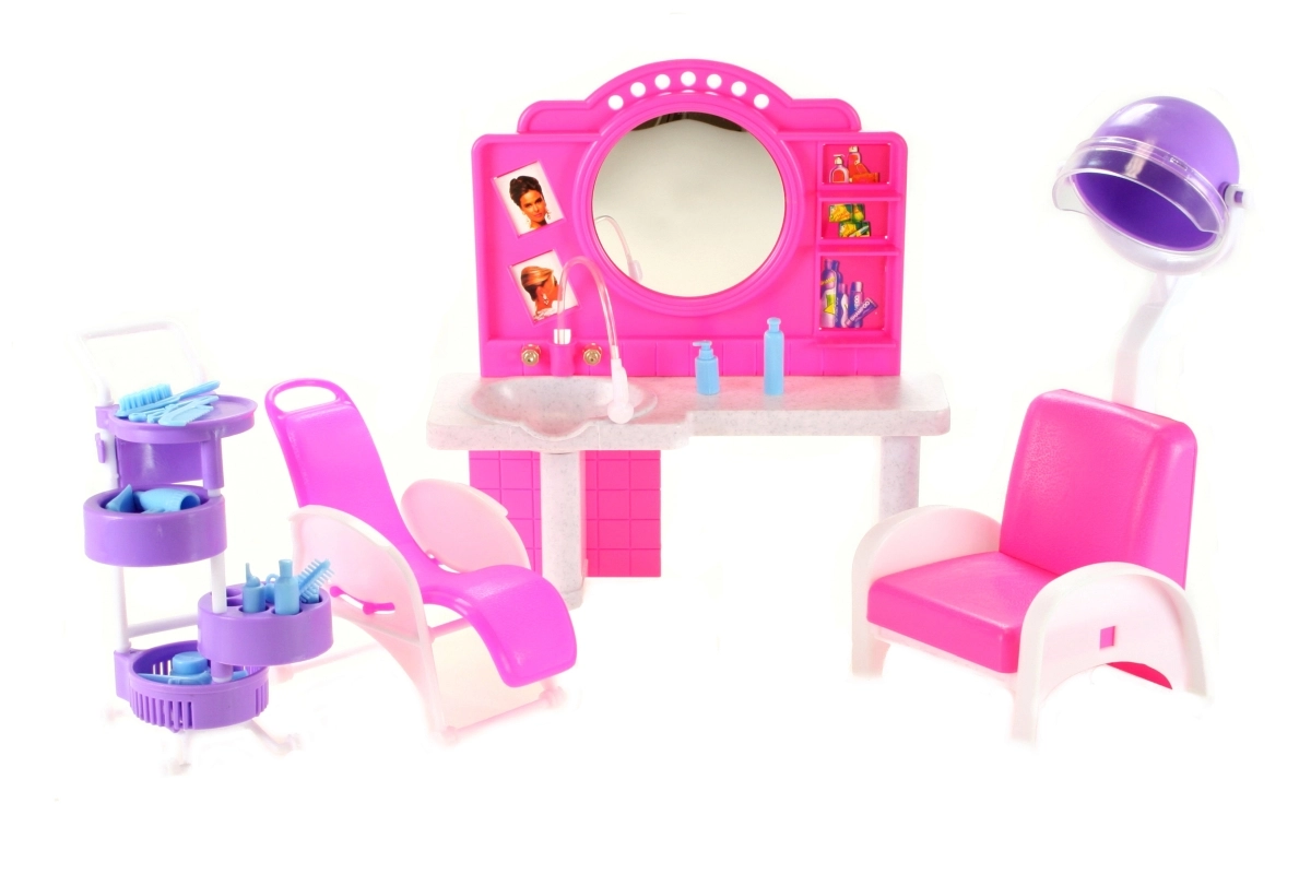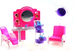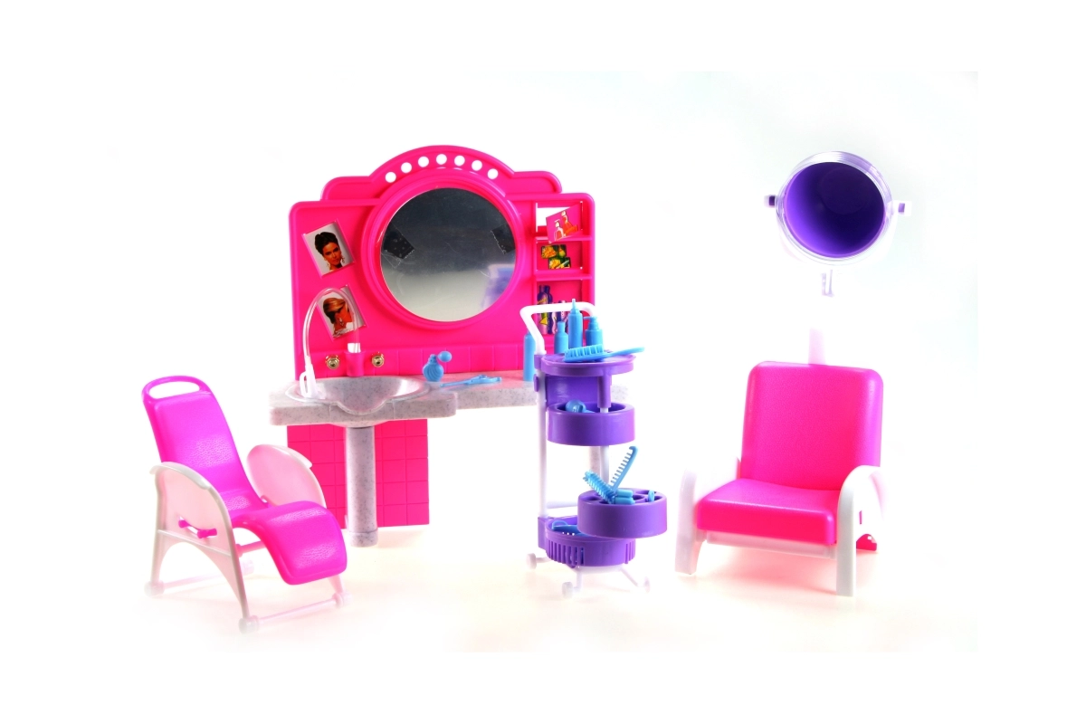 Das stilvolle Spielset Glorie Friseursalon bringt Kindern jede Menge Spaß beim Friseurspielen. Enthält eine Toilette mit Spiegel und Waschbecken, bequeme Friseurstühle, einen Wagen mit Fächern sowie zahlreiche Accessoires zur Haarpflege wie Kämme, Bürsten und Fläschchen. Hergestellt aus robustem Kunststoff. Puppe nicht im Lieferumfang enthalten. Geeignet für Kinder ab 3 Jahren.