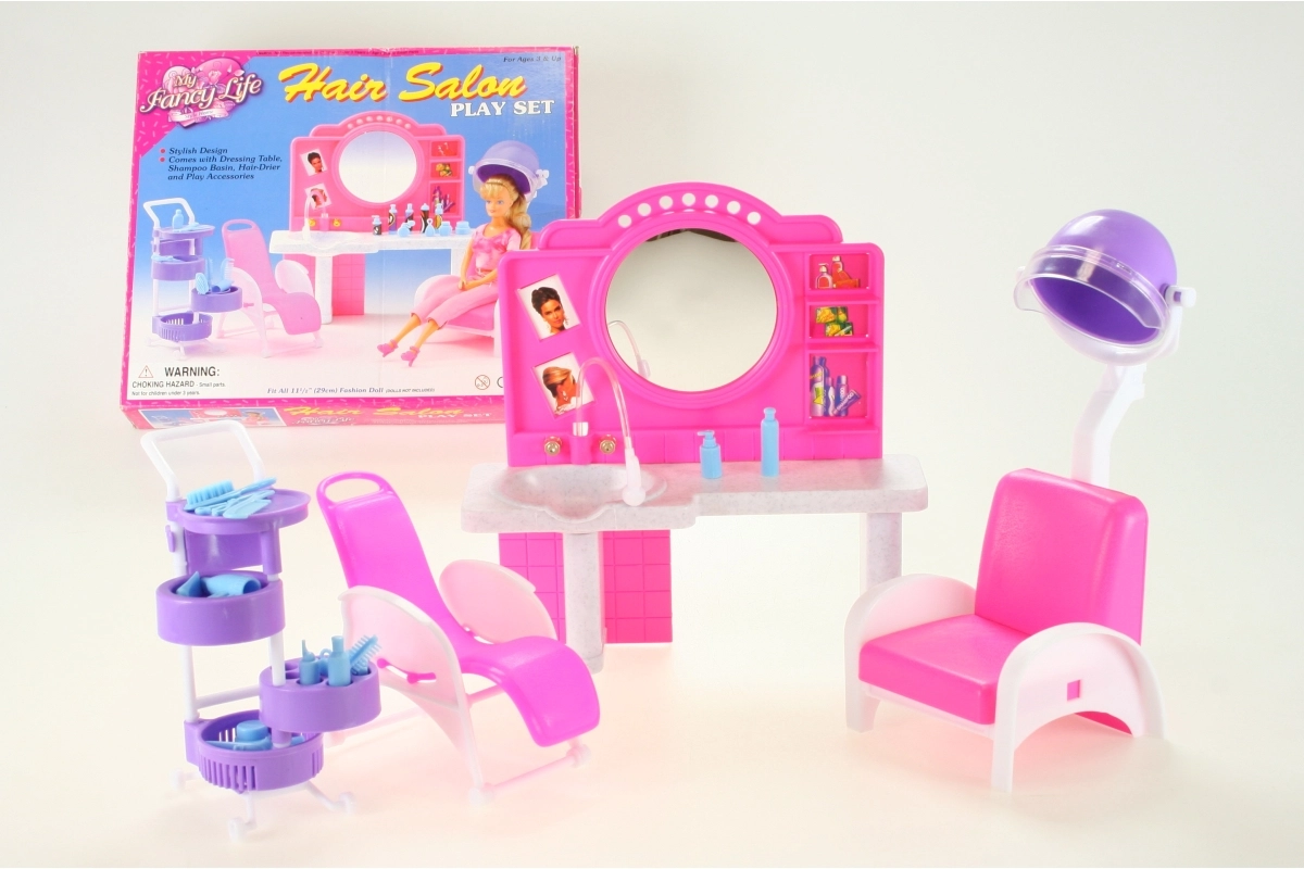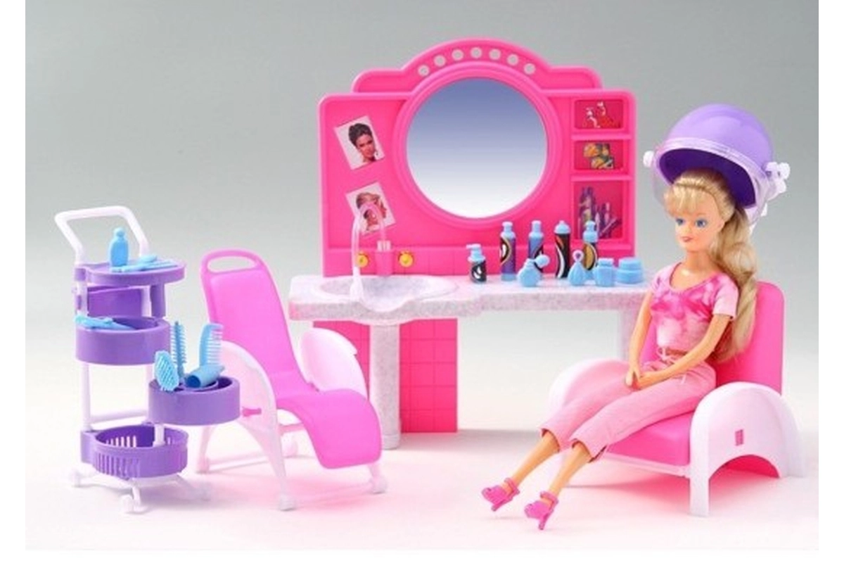 Richten Sie sich zu Hause einen kleinen Friseursalon mit dem Spielset Glorie Friseursalon ein. Kinder können in die Rolle der Friseurin schlüpfen, die Haare ihrer Lieblingspuppen stylen und dabei Fantasie sowie Feinmotorik fördern. Realistische Elemente wie die Frisierkommode mit Spiegel und Waschbecken, Friseurstühle und eine Haartrocknerhaube (dekorativ, nicht funktionsfähig) verleihen dem Spiel eine authentische Note.