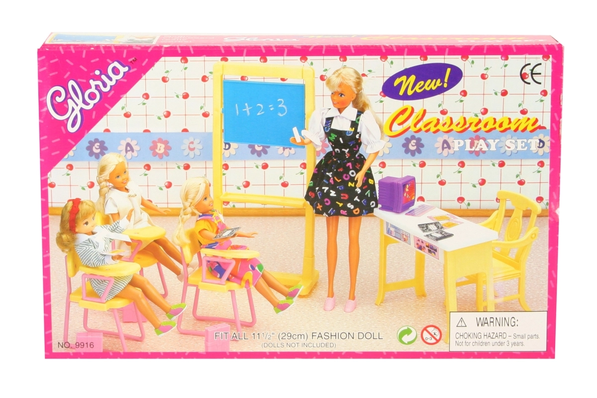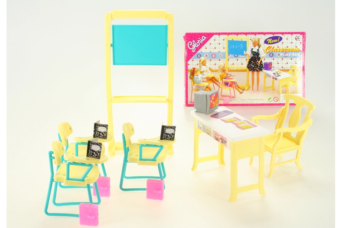 Schaffen Sie zu Hause eine eigene Schulatmosphäre mit dem Set Glorie Schulklasse. Dieses umfangreich ausgestattete Set bietet eine Tafel, Lehrertisch und -stuhl, 3 Stühle mit Armlehnen, Computer mit Tastatur, Taschen sowie papierene Hefte und Tests. Ideal für kreatives Spiel und die Entwicklung der kindlichen Fantasie. Puppen sind nicht im Lieferumfang enthalten.