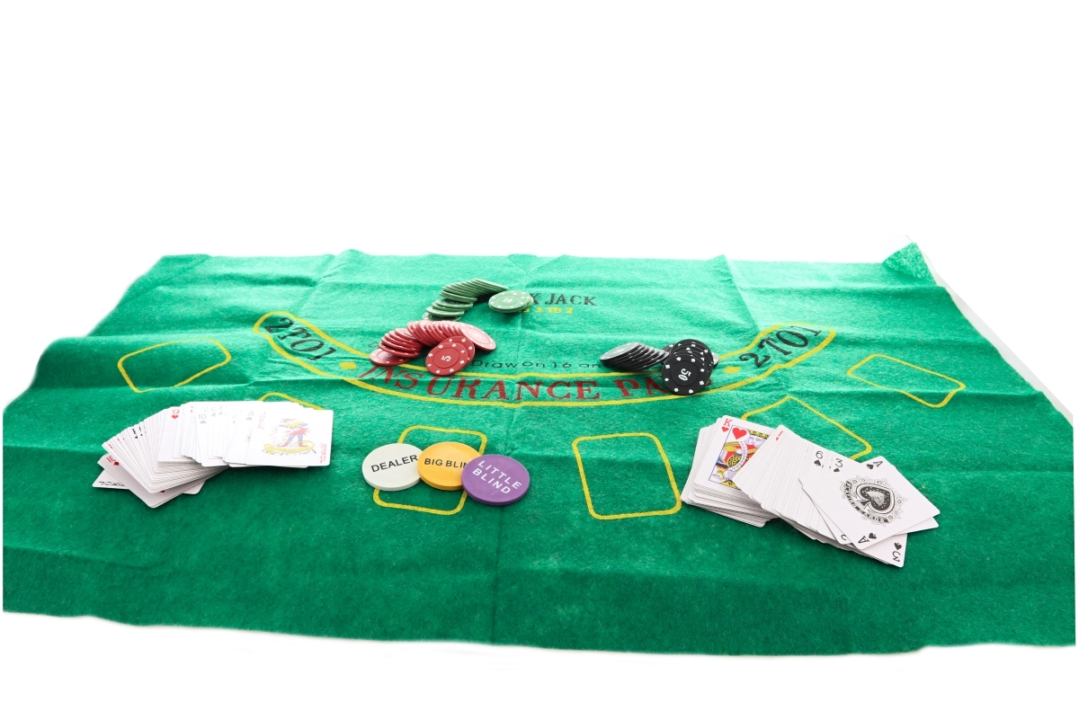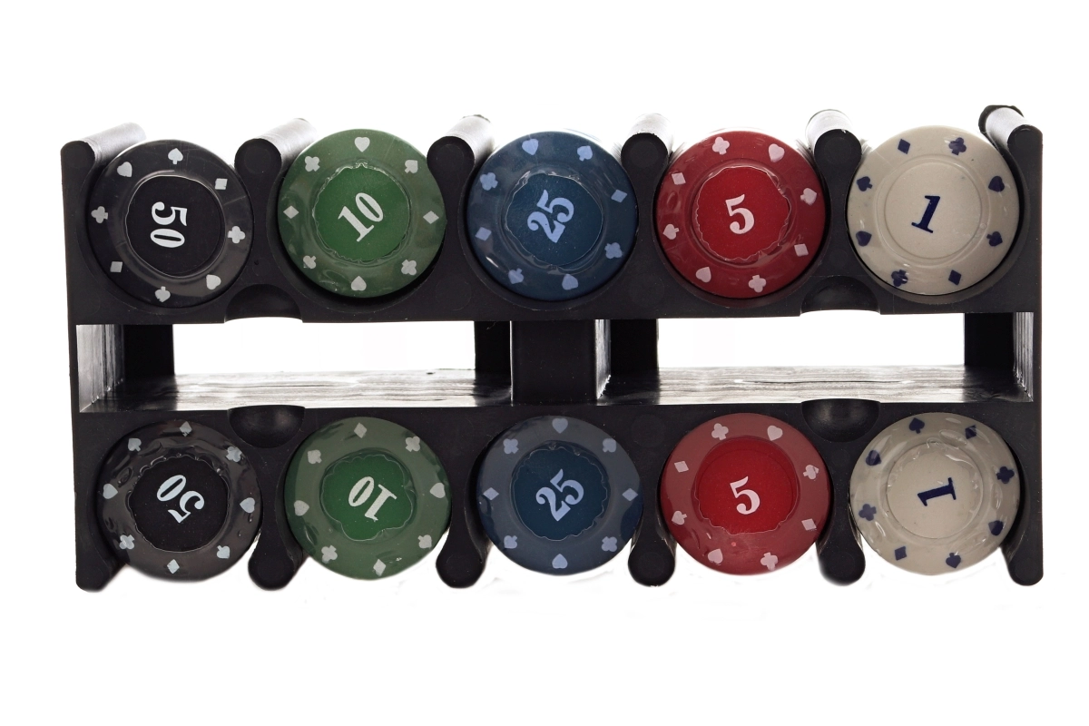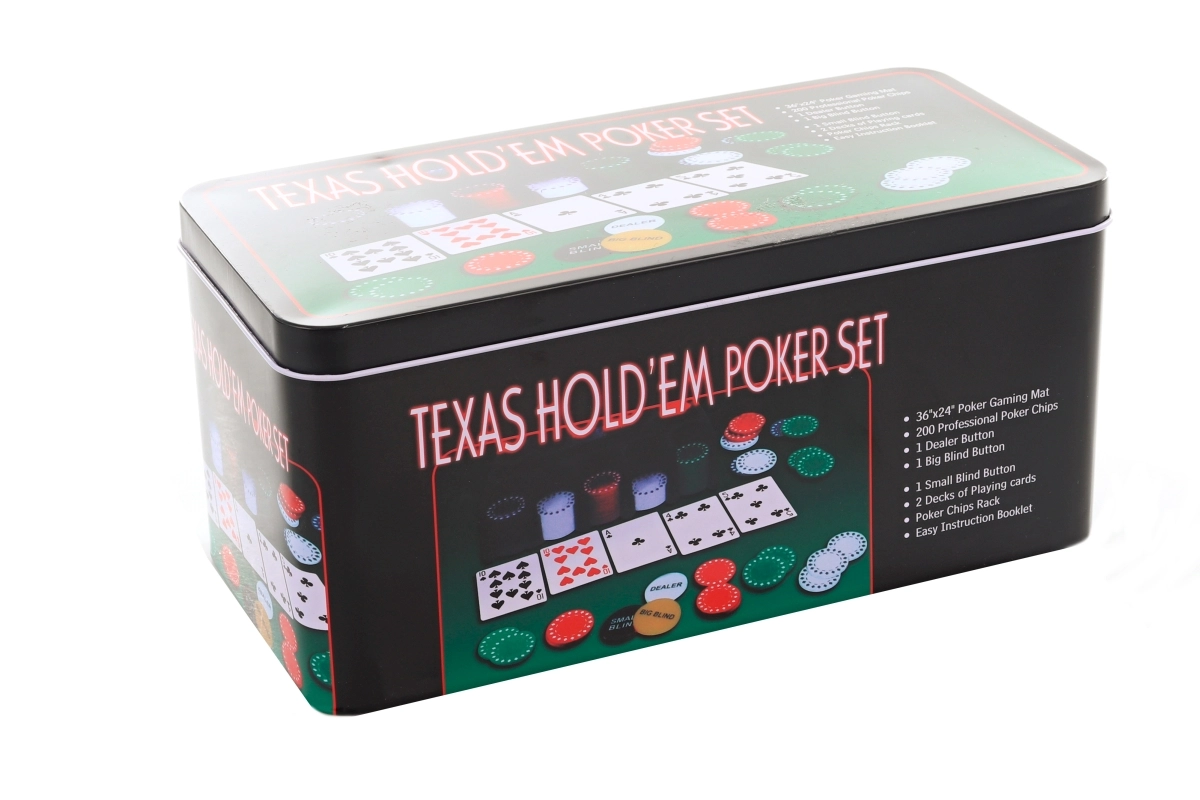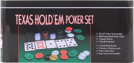 Das Set enthält Chips in verschiedenen Farben und Werten, Spielkarten und einen Dealer-Button für ein authentisches Spielerlebnis.
