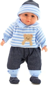 Baby mit weichem Körper. Das Baby ist in einen bunten Schlafanzug gekleidet, der abnehmbar ist (Klettverschluss). Maße des Babys ca. 35 x 17 x 8 cm. Verpackt in einem Plastikbeutel. Alter 3+