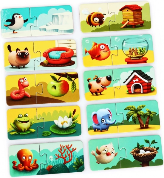 Das unterhaltsame Set Puzzlika Mein Zuhause bringt Kindern bei, Tiere mit ihren Lebensräumen zu verbinden. Es enthält 20 große, stabile Teile, die 10 Paare bilden. Fördert logisches Denken, Feinmotorik, Erkennen von Tieren und Umgebungen sowie visuelle Wahrnehmung. Hergestellt aus robuster, mehrschichtiger Pappe mit glänzender Oberfläche, leicht zu reinigen und ideal für Vorschulkinder.