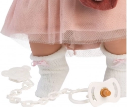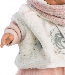 Puppe aus der Manufaktur Llorens garantiert hochwertigen und sicheren Spielspaß. Sie wird mit maximaler Präzision hergestellt und verwendet nur Stoffe von renommierten Marken. Julia kann weinen und 'Mama' und 'Papa' sagen, wenn ihr der Schnuller herausgenommen wird. Ihr wunderschönes Aussehen wird durch stilvolle Kleidung ergänzt: ein zweifarbiges Sweatshirt mit Aufdruck, ein Tüllrock, eine Fellweste, weiße Socken mit Schleifen und ein rosa Schal, was ein perfektes Outfit für Stunden voller Spaß schafft.