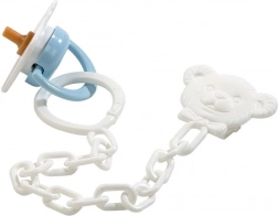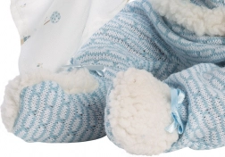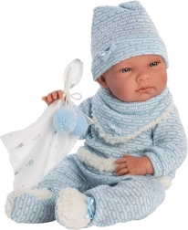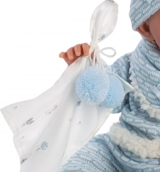 Neben der modischen blauen Decke mit Ohren, die zu seinem Outfit passt, gehört auch ein dekorativer Schnuller zur Ausstattung. Die Puppe ist in attraktiver Geschenkverpackung verpackt, die das Haus der Marke Llorens nachahmt.