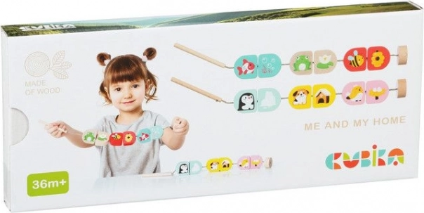 Das Holzset für Kinder Cubika „Wo wir wohnen“ verbindet Lernen und Spaß. Kinder suchen die richtigen Paare – Tier und sein Zuhause – und fädeln sie auf eine Schnur, wodurch sie ganz natürlich Feinmotorik und logisches Denken trainieren. Die Teile sind farbenfroh, robust und angenehm zu greifen.