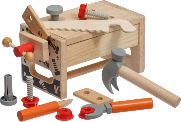 Hammer, Säge, Schraubendreher, Schraubenschlüssel, Schrauben, Muttern, Schraubstock und Holzteile mit Löchern – alles für realistisches Spielen und Lernen.