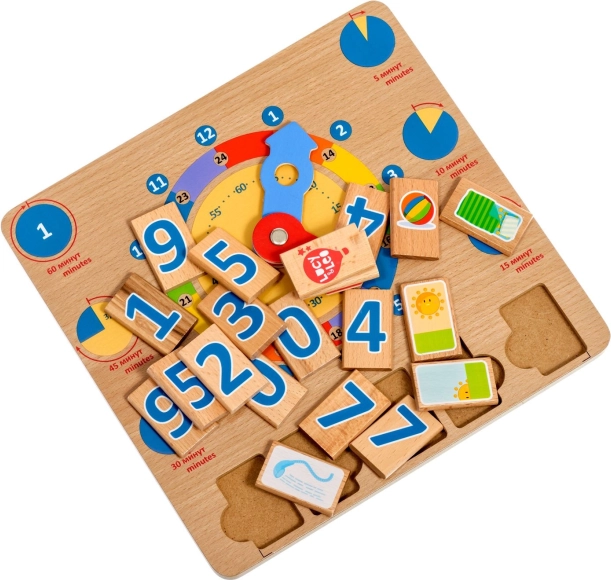 Enthalten sind 14 Zahlenblöcke und 6 Bildblöcke mit Tagesaktivitäten. Vier Zeitblöcke können in vorbereitete Schlitze eingesetzt werden, um eine digitale Uhrzeit zu bilden, während der fünfte Block die entsprechende Aktivität darstellt. So verknüpfen Kinder die analoge Uhr visuell mit der digitalen Darstellung und dem gewohnten Tagesablauf.