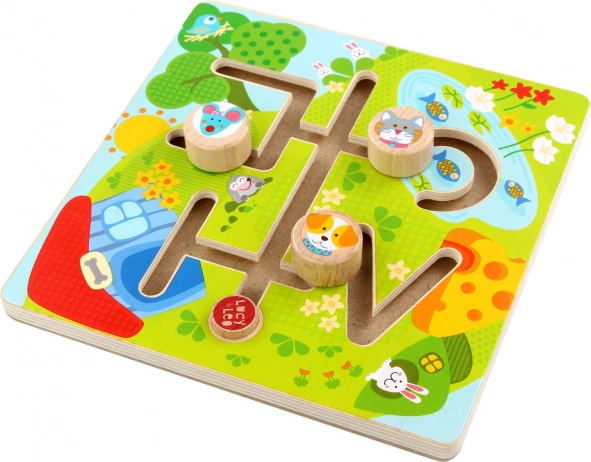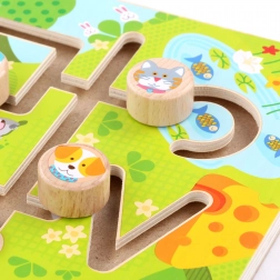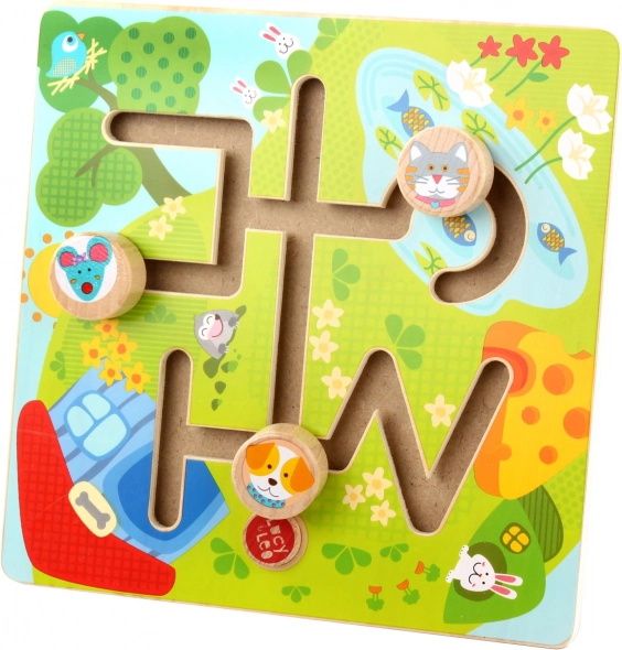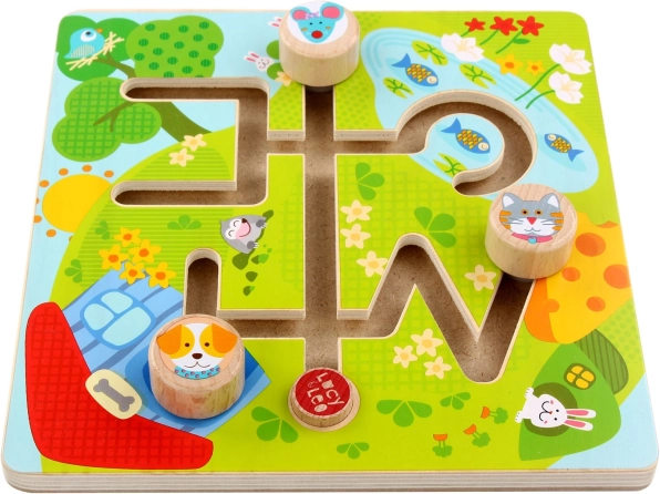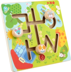 Das hölzerne Labyrinth Sonnental bringt Kindern Freude am Entdecken und Lernen. Die illustrierte Spielplatte mit Teich und Grün lädt zum Spiel ein, bei dem Hund, Katze und Maus ihre Ziele erreichen. Dank der geschmeidigen Rillen lassen sich die Figuren leicht schieben – das Spiel ist sicher und intuitiv.