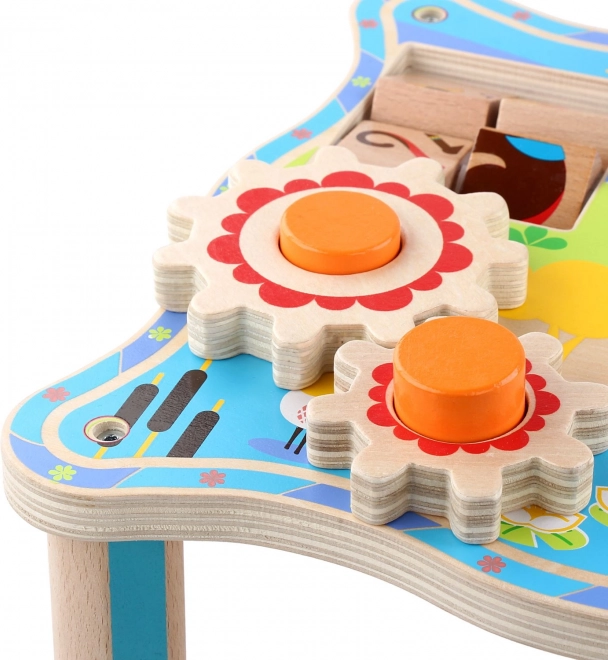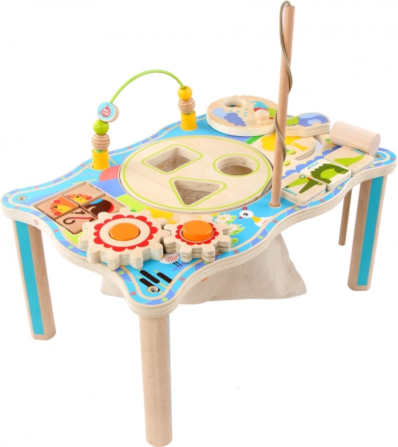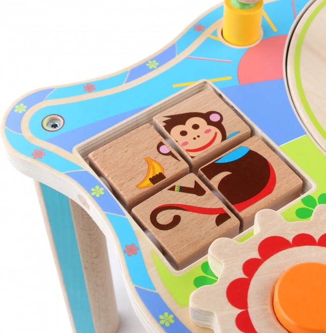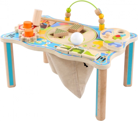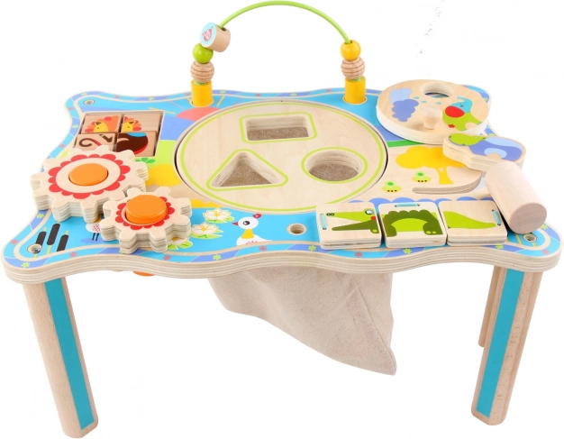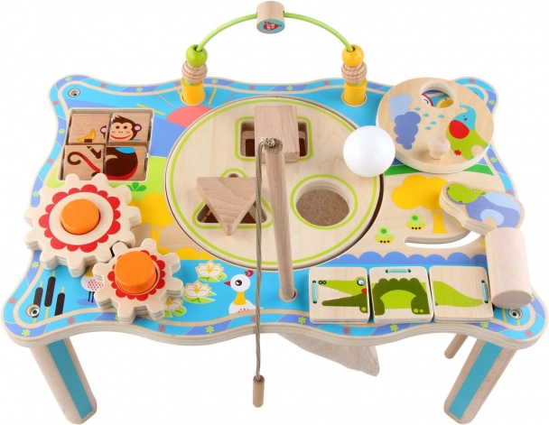 Der Holztisch mit Dschungelmotiven verbindet Spaß mit Lernen und fördert Feinmotorik, Hand-Auge-Koordination und logisches Denken. Kinder können Zahnräder drehen, Perlen auf der Bahn schieben, mit der Klopfbank Kraft und Konzentration trainieren und durch das Steckspiel die Formenwahrnehmung üben. In der Mitte befindet sich ein Leinenbeutel für geangelte Fische und Spielteile, der die Spielfläche ordentlich hält.