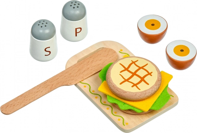 Stabile Holzteile werden durch textile Scheiben von Käse und Salat ergänzt. Robuste Ausführung und satte Farben sorgen für langen und sicheren Spielspaß.