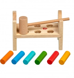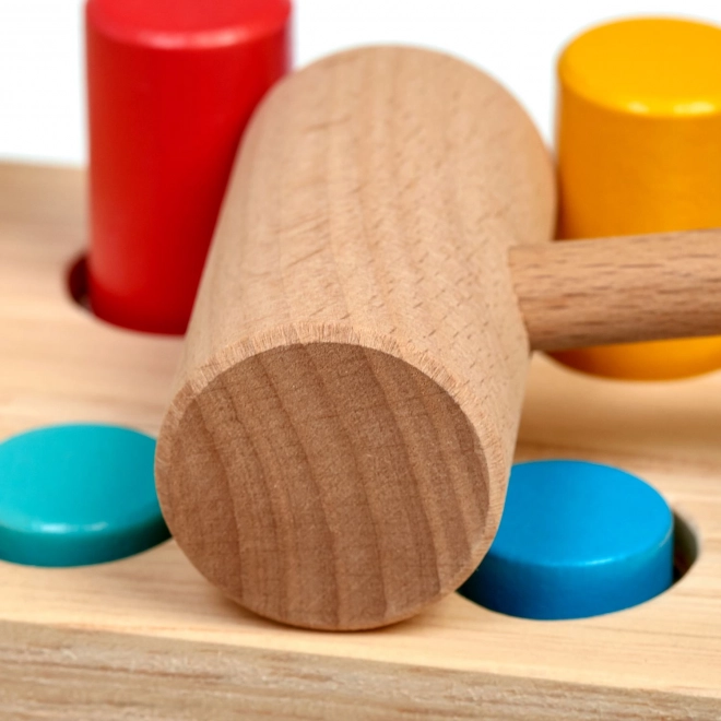 Sechs farbige Stifte und ein Holzhammer schulen den präzisen Griff, die Schlagkraft und die Hand-Auge-Koordination.