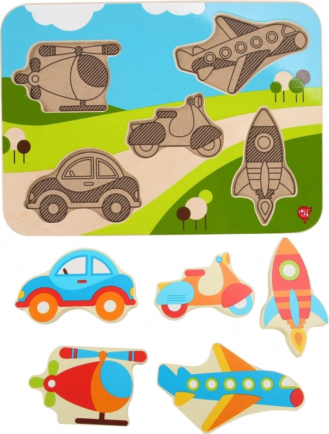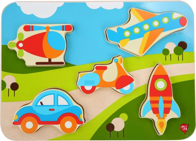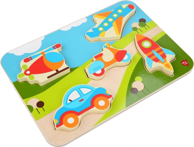 Dieses hochwertige Holz-Einlegepuzzle zum Thema Verkehrsmittel überzeugt mit leuchtenden Farben und klaren Formen, die Kinder leicht greifen und an ihren Platz legen können. Einige Teile können dank ihrer Dicke sogar selbstständig stehen, sodass Kinder auch abseits der Einlegeplatte damit spielen können.