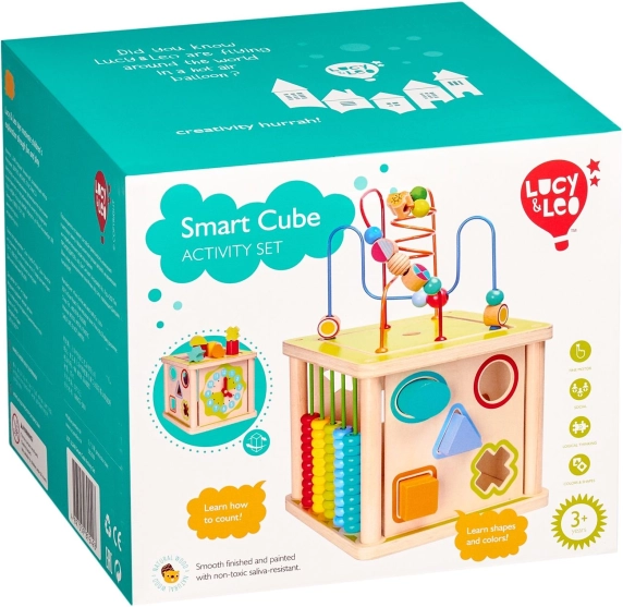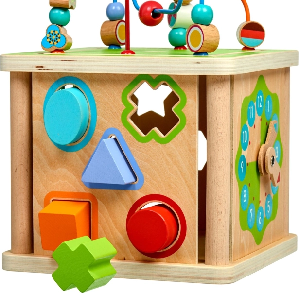 Dieser hochwertige 5-in-1 Holz-Motorikwürfel LUCY & LEO ist das ideale Lernspielzeug für kleine Entdecker. Er bietet mehrere Aktivitäten in einem: ein Perlenlabyrinth auf der Oberseite, eine Uhr mit beweglichen Zeigern, zwei Formensortierer und ein farbiges Rechenbrett. Dank der durchdachten Ausführung fördert er Hand-Auge-Koordination, Konzentration und räumliche Vorstellungskraft.