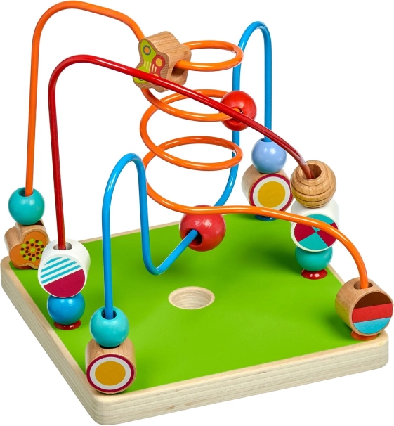 Bunte Perlen auf gebogenen Drähten fördern Koordination und Geduld. Durch das Verschieben der Perlen trainieren Kinder ihren Griff und die Konzentration.
