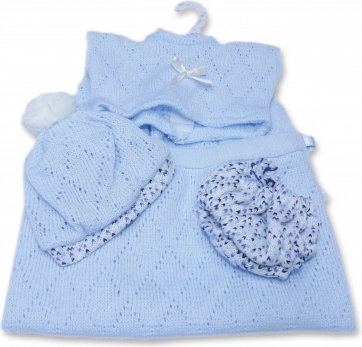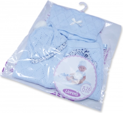 Das Kleidungsset für eine Babypuppe in der Größe 26 cm umfasst einen Pullover, eine Mütze und Höschen. Es ist so entworfen, dass es maximalen Komfort und Eleganz ins Puppenspiel bringt. Das Set enthält auch eine fein gestrickte Decke, die das Gesamtbild ergänzt. Dieses Set ist in einer transparenten Verpackung mit einem Kleiderbügel aus Plastik oder Karton verpackt.