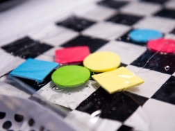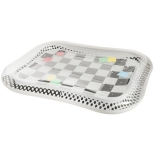 Entdecken Sie die kontrastreiche Wasser-Spielmatte, die nicht nur Ihr Kind fasziniert, sondern auch seine sensorische und motorische Entwicklung fördert. Diese Matte mit schwarz-weißem Schachbrettmuster enthält schwimmende bunte geometrische Formen, die sich bei Berührung des Kindes bewegen.