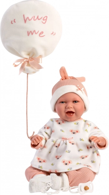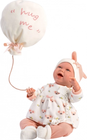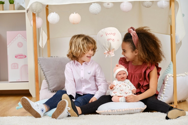 Stilvolles 4-teiliges Outfit-Set für Puppen NEW BORN in der Größe 40–42 cm bringt zarte Pastellfarben, wärmende Materialien und ein niedliches Schnuffeltuch in Ballonform mit der Aufschrift „hug me“. Perfekt für komfortables Umziehen, realistisches Pflege‑Rollenspiel und als Geschenk für kleine Puppenliebhaber. Hergestellt in Spanien, empfohlen ab 3 Jahren.