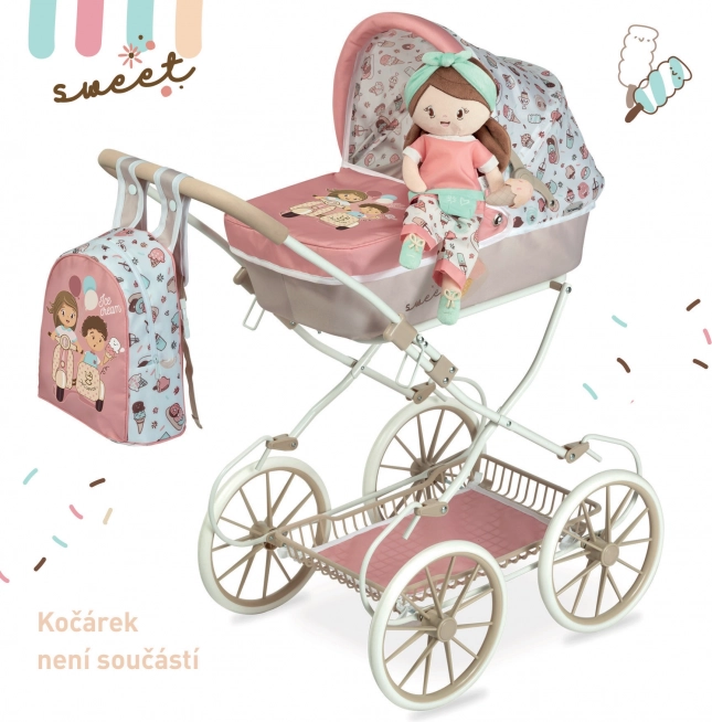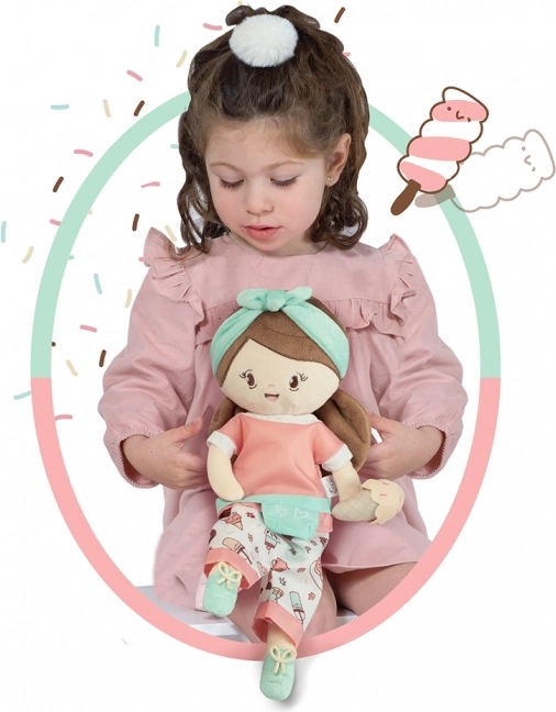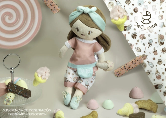 Die niedliche Plüschpuppe Sweet in der Größe 36 cm ist die ideale erste Freundin für die Kleinsten. Sie besteht aus weichem, glänzendem Plüsch, ist sehr leicht, kuschelig und kann von Hand bei 30 °C gewaschen werden. Harmonische Farben mit Eiscreme-Motiv und spanischem Design erfreuen jede kleine Prinzessin.