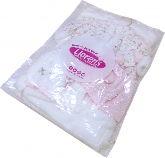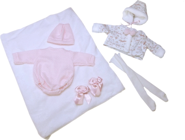 Dieses 6-teilige Set enthält ein dekoratives Fleece-Wendedecke mit Schleife und ist perfekt für eine New Born Puppe von Llorens in der Größe 43-44 cm.