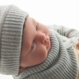 Puppe Pipo ist ein einzigartiges Stück mit handgemalten Details, wie feinem Haar, kleinen Nägeln, zarten Äderchen, natürlich geröteter Haut in den Falten und flaumiger Haut. Alles wird sorgfältig mit Acrylfarben gestaltet, was besondere Pflege beim Umgang erfordert, da das Produkt nicht mit Wasser in Berührung kommen sollte.