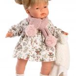 Willkommen in der Welt der spanischen Puppen Llorens, wo ein Spielzeug mehr ist als nur ein Spielzeug. Joelle ist eine 38 cm große Puppe, die ein elegantes weißes Kleid mit einem rosa Schal mit Bommeln trägt, ergänzt durch eine weiße Weste. Ihr blondes Haar ist zu zwei niedlichen Zöpfen gestylt.