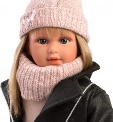 Carla trägt eine moderne Kombination: schwarze „Biker“-Jacke in Lederoptik, dunkler Rock mit Fuchs-Print, gestrickte rosafarbene Mütze mit Bommel, Schlauchschal, Socken und Schühchen. Eine kleine gestrickte Handtasche ist ebenfalls dabei. Dank der EU-Sicherheitsnormen ist das Spielen mit der Puppe maximal sicher. Sie wird in einer dekorativen Geschenkbox geliefert – ideal als Geschenk.