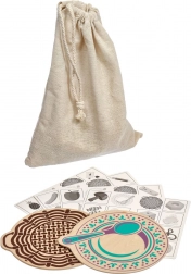 Im Set enthalten sind außerdem 4 schwarz-weiße Vorlagen für schnelle Reaktionsspiele und Sortiertraining. Die Plättchen können nach dem Spielen im verschließbaren Leinensäckchen aufbewahrt werden, sodass nichts verloren geht. Die Holzteile haben glatte Kanten und klare, verständliche Illustrationen für einfaches Erkennen, inklusive kniffliger Motive wie Pilze – einige essbar, andere ungenießbar.