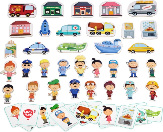 Die umfangreiche Sammlung magnetischer Teile und beidseitiger Karten motiviert Kinder sowohl zum richtigen Zuordnen als auch zu freier Kreativität beim Entdecken verschiedener Berufe.