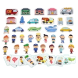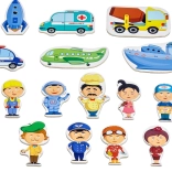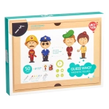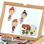 Entdecken Sie ein unterhaltsames und lehrreiches magnetisches Spiel in einem Holzkoffer, das Kindern hilft, verschiedene Berufe kennenzulernen. Das Set enthält 17 beidseitige Karten und 50 Teile mit Figuren und Fahrzeugen zum freien Kombinieren. Der Deckel des Koffers dient als beidseitige Tafel – weiß für Marker und schwarz für Kreide – für noch mehr Kreativität. Ein ideales Hilfsmittel zur Förderung der Feinmotorik, Fantasie und des logischen Denkens für Kinder ab 3 Jahren.